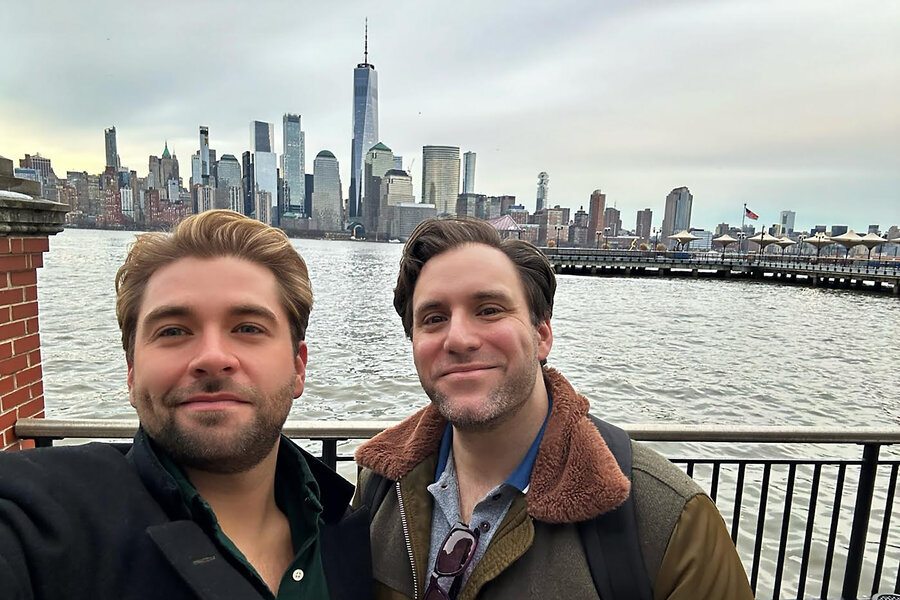 Coleman Hemsath (left) and Steven Jamail take a celebratory picture on the day of their big move, Jersey City, New Jersey, March 1, 2024.