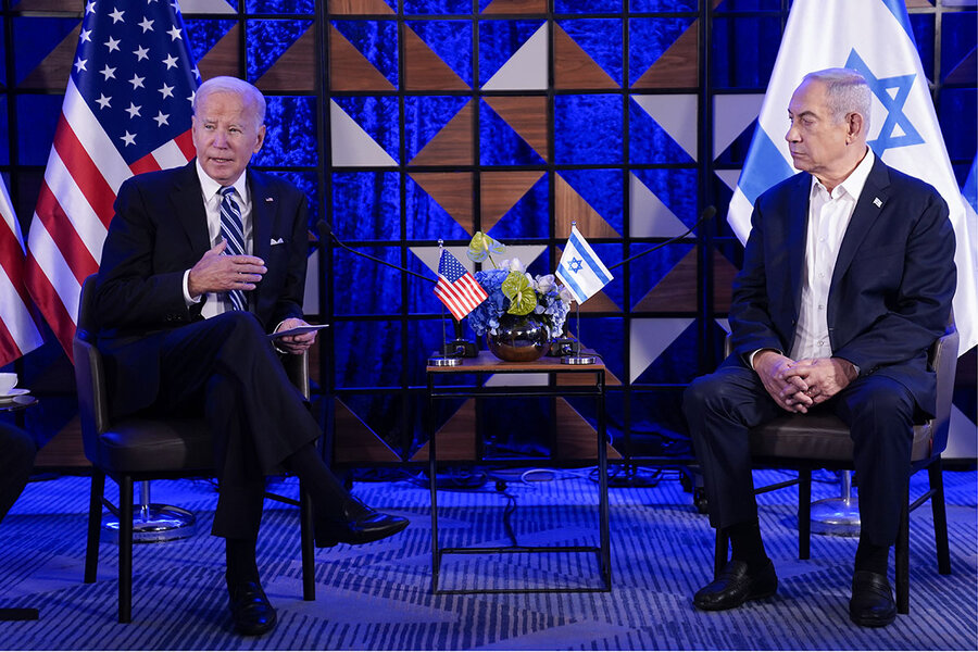 President Joe Biden speaks as he meets with Israeli Prime Minister Benjamin Netanyahu, Wednesday, Oct. 18, 2023, in Tel Aviv.