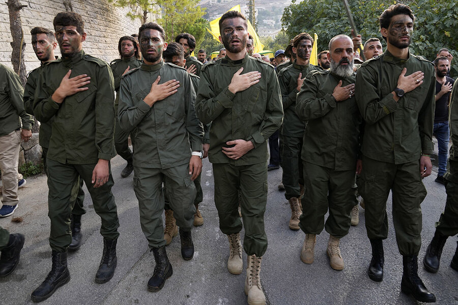 Hezbollah fighters mourn as they attend the funeral procession for two comrades who were killed by Israeli shelling, in Kherbet Selem village, south Lebanon, Oct. 10, 2023.