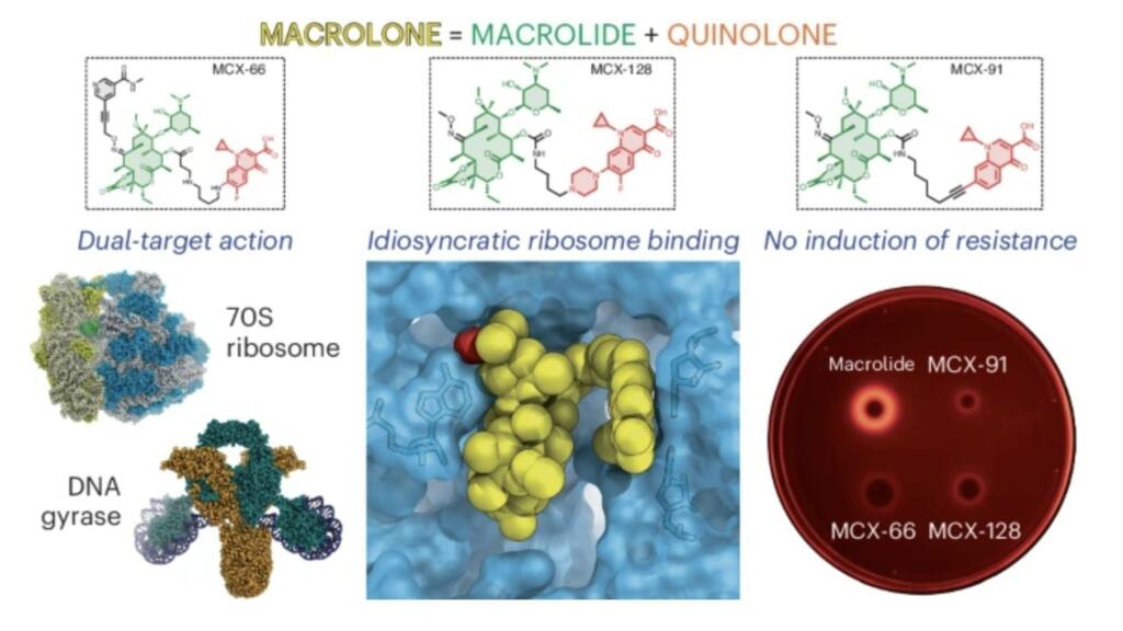 Macrolones are synthetic antibiotics that combine the structures of two widely used antibiotics with different mechanisms. Macrolides, such as erythromycin, block the ribosome, the protein-manufacturing factories of the cell. Fluoroquinolones, such as ciprofloxacin, target a bacteria-specific enzyme called DNA gyrase.