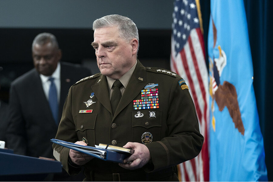 Chair of the Joint Chiefs of Staff Gen. Mark Milley and Secretary of Defense Lloyd Austin (in background) arrive for a news conference at the Pentagon in Washington, July 18, 2023.