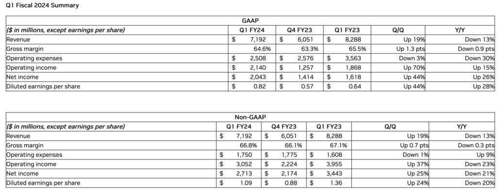 NVIDIA (NASDAQ: NVDA) today reported revenue for the first quarter ended April 30, 2023, of $7.19 billion, down 13% from a year ago and up 19% from the previous quarter.