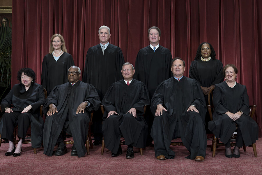 Members of the U.S. Supreme Court sit for a group portrait Oct. 7, 2022. Bottom row, from left, Justice Sonia Sotomayor, Justice Clarence Thomas, Chief Justice John Roberts, Justice Samuel Alito, and Justice Elena Kagan. Top row, from left, Justice Amy Coney Barrett, Justice Neil Gorsuch, Justice Brett Kavanaugh, and Justice Ketanji Brown Jackson.