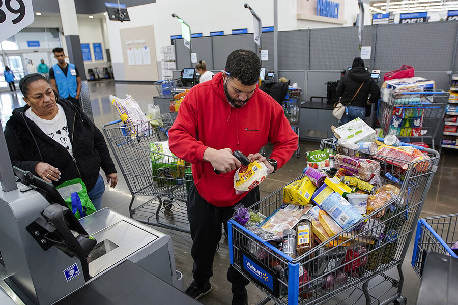 Francisco Santana buys groceries at Walmart Supercenter in North Bergen, New Jersey, Feb. 9, 2023. The pace of inflation for groceries is slowing.