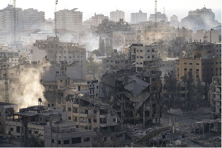 Destruction from Israeli aerial bombardment is seen in Gaza City, Oct. 11, 2023. Palestinian health officials reported hundreds of deaths from Israeli airstrikes in Gaza.
