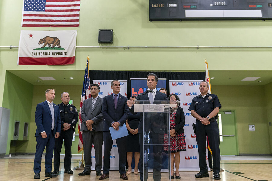 Alberto Carvalho (center, at podium), superintendent of the Los Angeles Unified School District, the second-largest school district in the United States, speaks about an external cyber incident on the LAUSD information systems in Los Angeles, Sept. 6, 2022.