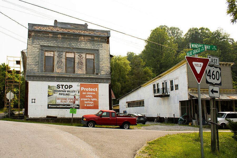 A sign opposing the Mountain Valley Pipeline can be seen on the side of a building in Newport, Virginia. Similar signs crop up throughout many small towns along the pipeline’s path.