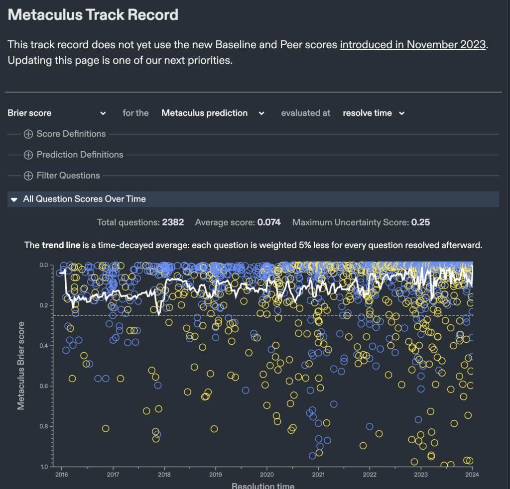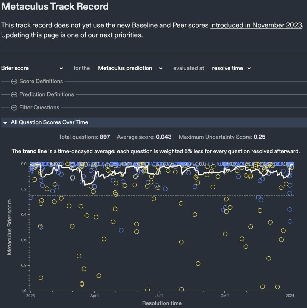 In 2023, the Metaculus site had 847 correct predictions out of 897 predictions made. They made 50 incorrect predictions in 2023. There were right 94.4% of the time. The employees of the company make predictions using all of the information that thousands of forecasters are providing. They have a transparent view of what the crowd of forecasters are predicting and they can look at what the forecasters with the best track records are doing.