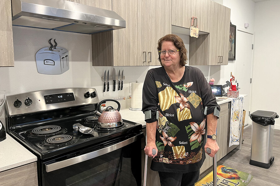 Joy Walsh stands in front of her kitchen area in her ground-floor unit in the affordable housing apartments for older adults, Capriccio, built by Ovation Development Corporation, May 31, 2024.