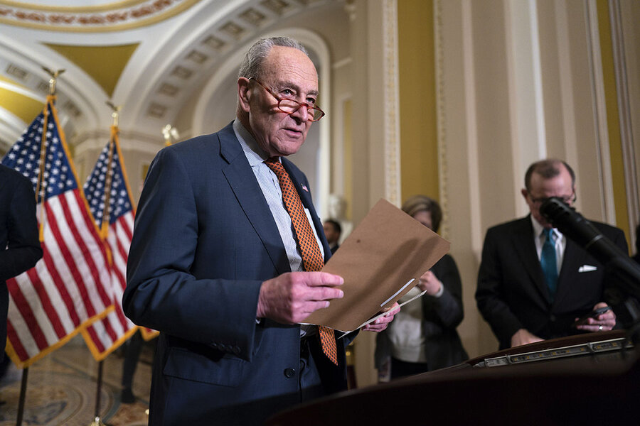 Senate Majority Leader Chuck Schumer of New York arrives to speak with reporters at the Capitol in Washington, May 3, 2023. Mr. Schumer has released a general framework of what regulation of artificial intelligence could look like.