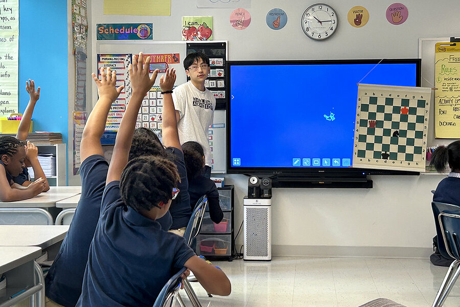 Fifth graders at Harlem Academy raise their hands Nov. 27, 2023, to tell chess coach Tommy Zhang where to move the chess pieces on a hanging board.