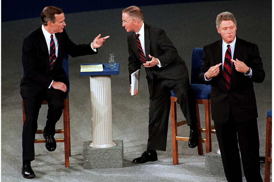 President George H.W. Bush (left) talks with independent candidate Ross Perot as Democratic candidate Bill Clinton stands aside at the end of their second presidential debate, in Richmond, Virginia, Oct. 15, 1992.