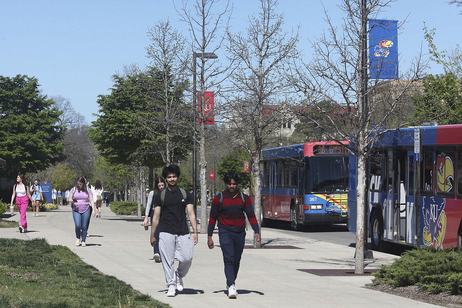 Students walk down Jayhawk Boulevard through the main University of Kansas campus, April 12, 2024, in Lawrence. The Kansas Board of Regents, which oversees higher education, has drafted a new policy against requiring diversity, equity, and inclusion statements on applications for students and those seeking jobs or promotions.