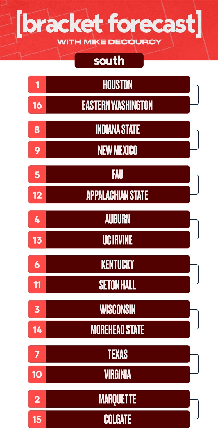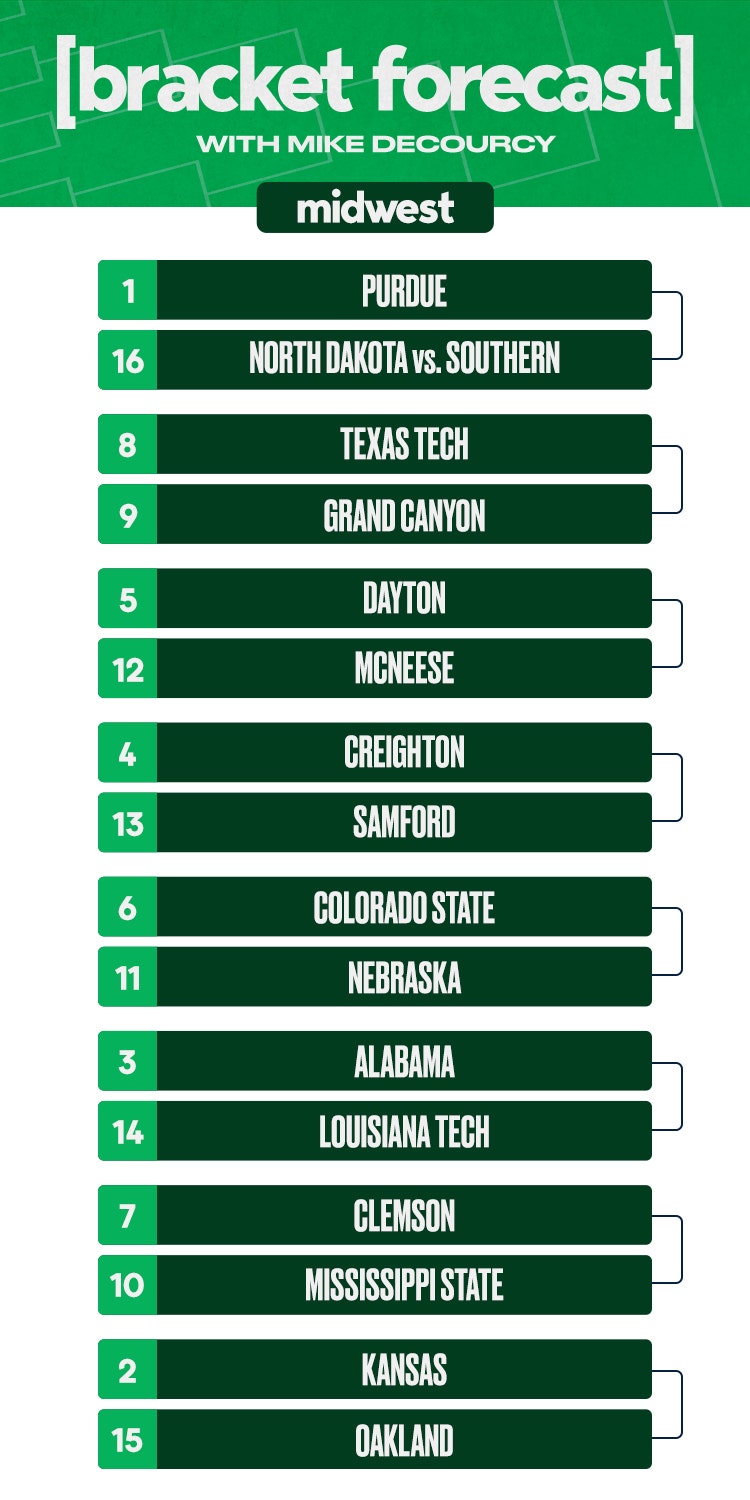 The No. 1 seeds in DeCourcy’s latest projections remain unchanged, with UConn (East), Houston (South), Purdue (Midwest) and North Carolina (West) at the top.