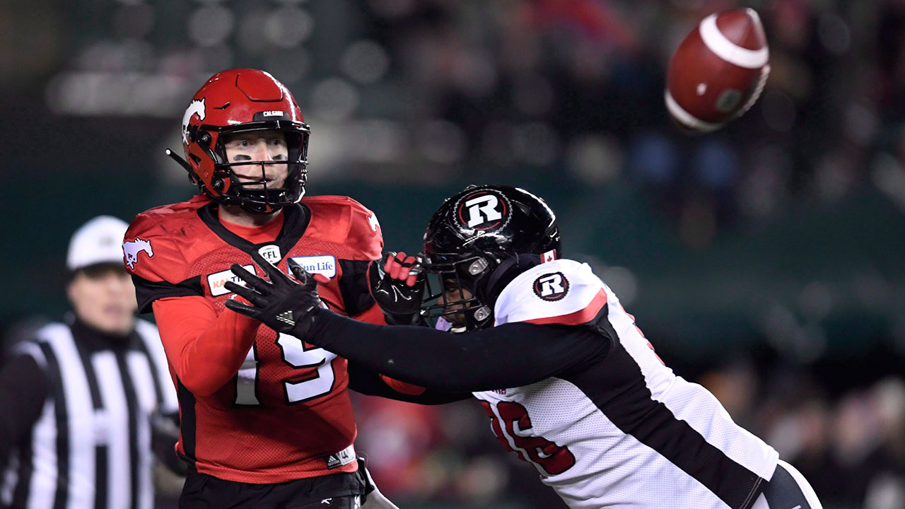 Ottawa Redblacks defensive lineman Michael Wakefield (96) tries to sack Calgary Stampeders quarterback Bo Levi Mitchell (19) during the first half of the 106th Grey Cup. (CP)