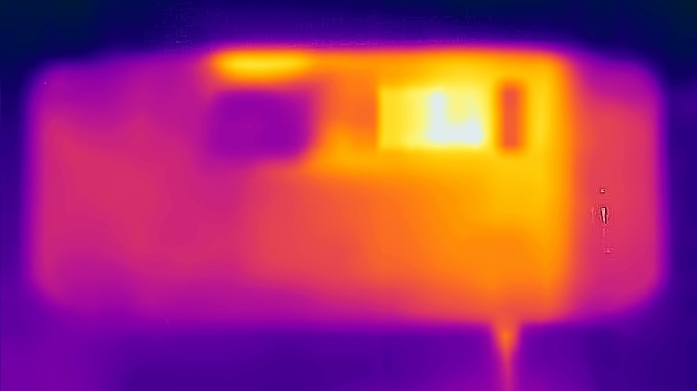 Even pushing the Legion Go to its limit, it remained quiet and comfortable to hold. At worst, it emitted a constant whoosh of air, but the volume and quality of the sound were never offensive, even in a quiet room. This became all the more impressive when we took a look through a thermal camera and found that temperatures were very well controlled. Most of the Legion Go barely heats up at all, and there’s really only one major hotspot in the upper left-hand corner of the display. From the front, this never exceeded 114.8 degrees Fahrenheit (46 degrees Celsius), while it hovered around 149 degrees Fahrenheit (65 degrees Celsius) when measured on the back panel.
